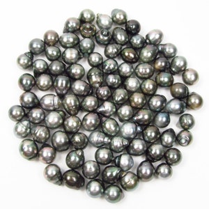 pearls: lot of 5 guaranteed authentic baroque Tahitian black pearls Pearl measurement: 14-15mm in diameter, 16-18mm in length Pearl shape: tear drop, short oval, baroque and irregular Pearl surface: some surface lines and natural dents and imperfections Pearl color: all natural black with possible silver, green and brown overtones (not dyed or treated) Luster: high Nacre: greater than 0.8mm required by Tahiti law