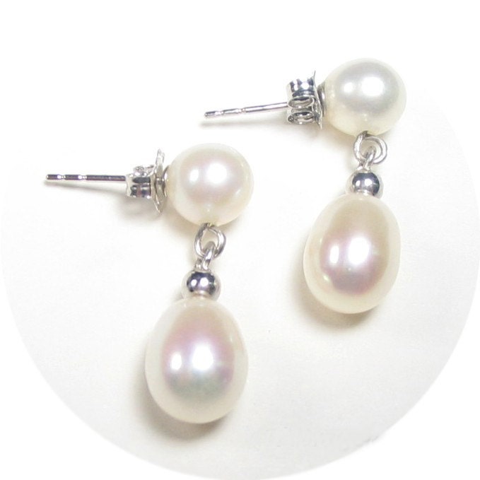 Gorgeous genuine white pearl post dangle earrings in 14K solid yellow or white gold